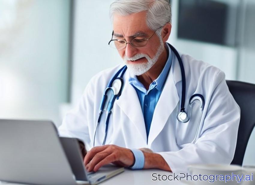adult blue caucasian cheerful clinic computer cute doctor general practitioner good looking grey hair handsome happy health healthcare holding hospital job laptop looking male man mature medical mid age middle aged modern nurse occupation office person portrait profession professional scrubs senior smiling standing stethoscope successful surgeon technology uniform wireless work worker workplace-