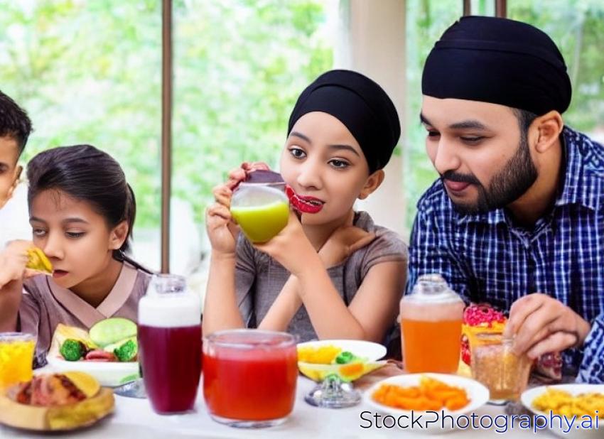 muslim asian family breaking the fast together having some sweet drink