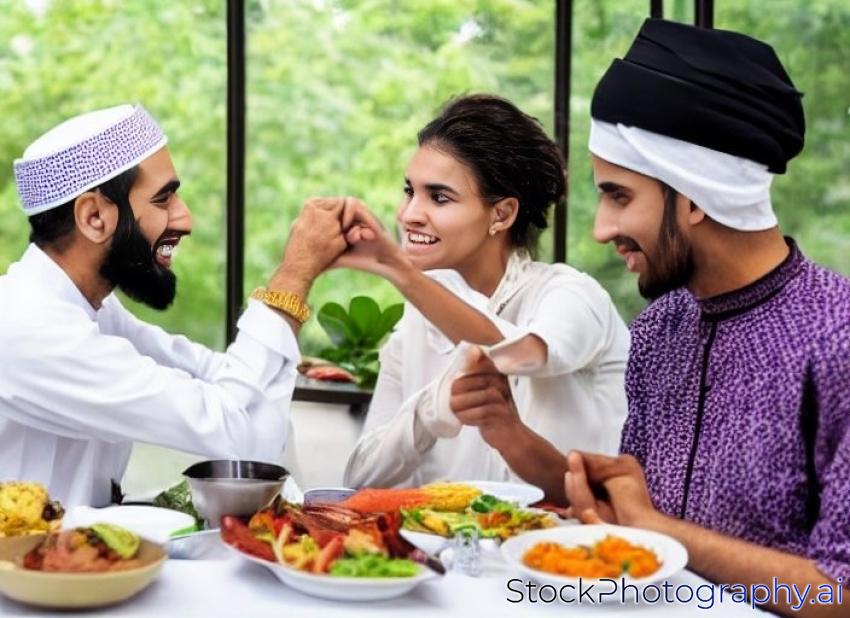 muslim man and woman having greeting at dining table during lunch and diner during ramadan celebration, break fasting