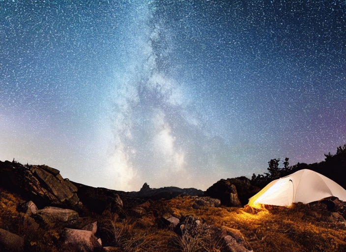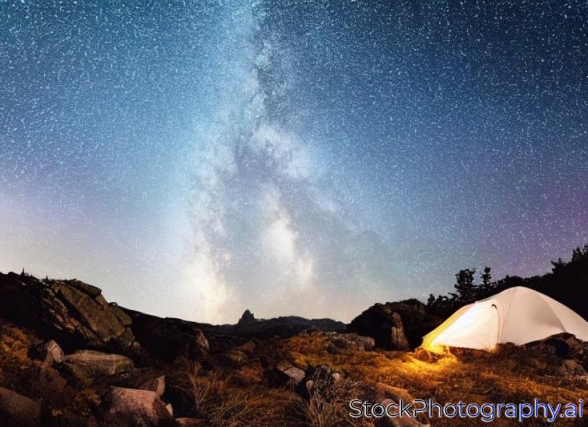 night rocky ravine. starry sky with bright milky way. an illuminated tent