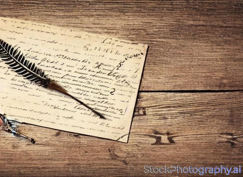 old letter with clock, feather quill and wax seal. vintage background. selective focus