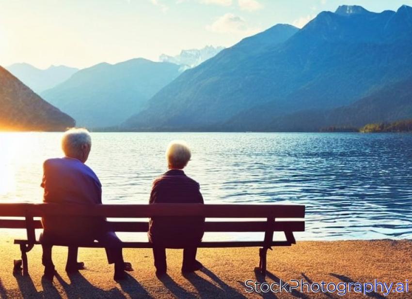 older couple man, woman are sitting on a park bench at a beautiful sea lake see and look into a colorful sundown - in the background you can see the mountains alps