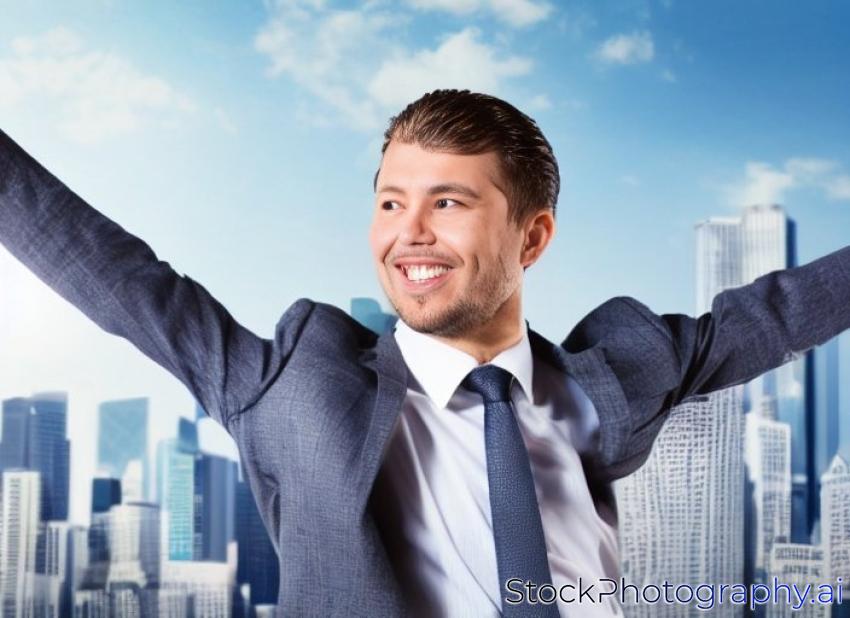 adult arms blue business businessman career carefree copy day employee energy excitement finance freedom freetime hands happiness happy independence leisure man open outdoors outstretched people person raised sky space spiritual spring standing stretching success suit summer summertime sun sunny wide work young-