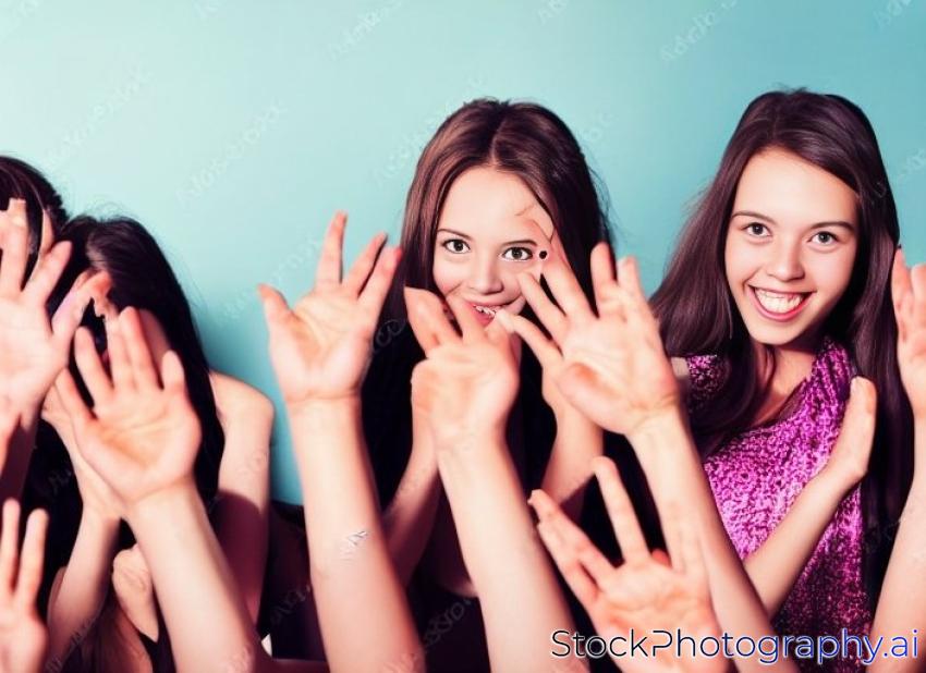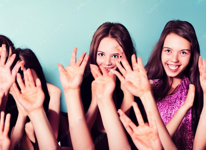party girls stretch their hands in the camera