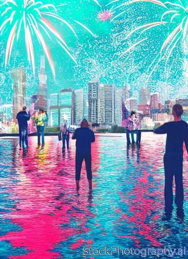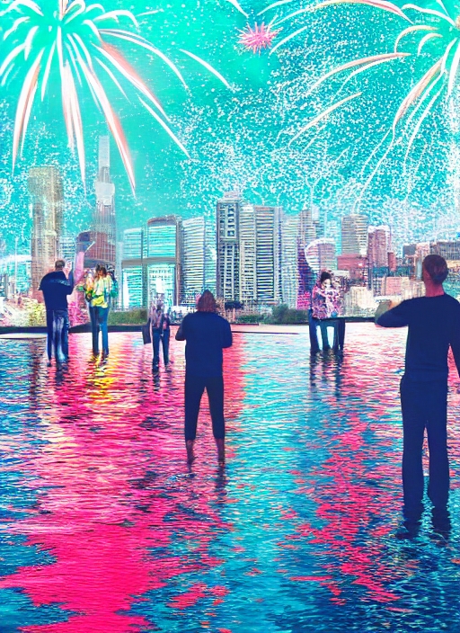 people stand watching for firework shows. digital compositing, colour tone, water reflection and ripple effects.
