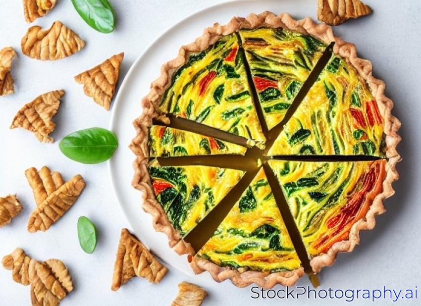 pieces of quiche with vegetables on a plate isolated on white background
