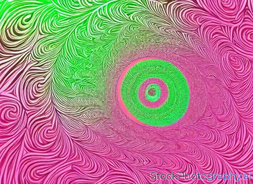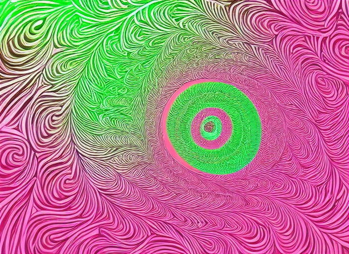 pink and red fractal spiral on abstract leafy green background