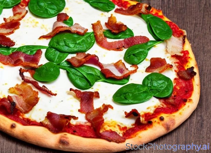 pizza with bacon, mozzarella and spinach in a light woody background. tinting. selective focus