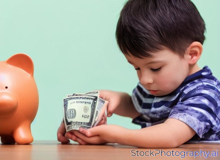 portrait of a little boy putting money on a moneybox
