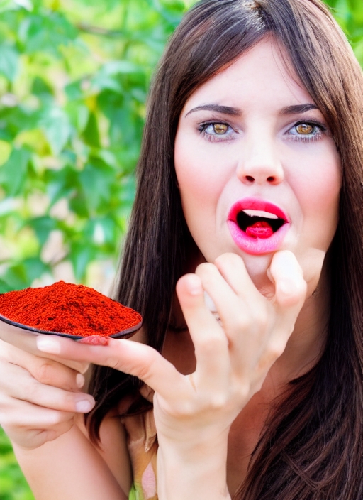 portrait of beautiful brunette girl biting spicy hot red cayenne chili pepper