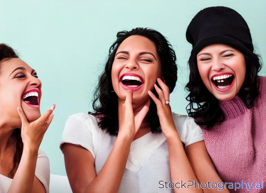 portrait of three beautiful women laughing together watching funny movie