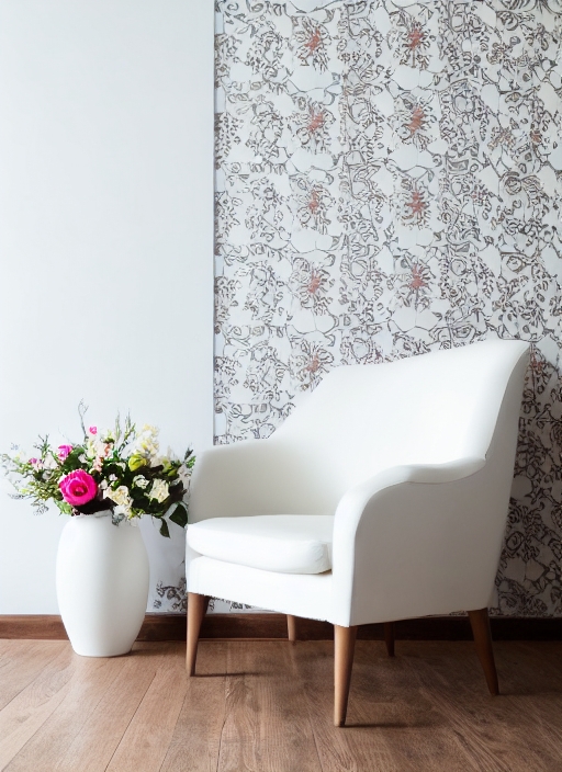 portrait of white vintage style armchair and vase of flowers on desk with white patterned wall on background