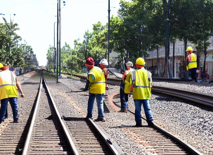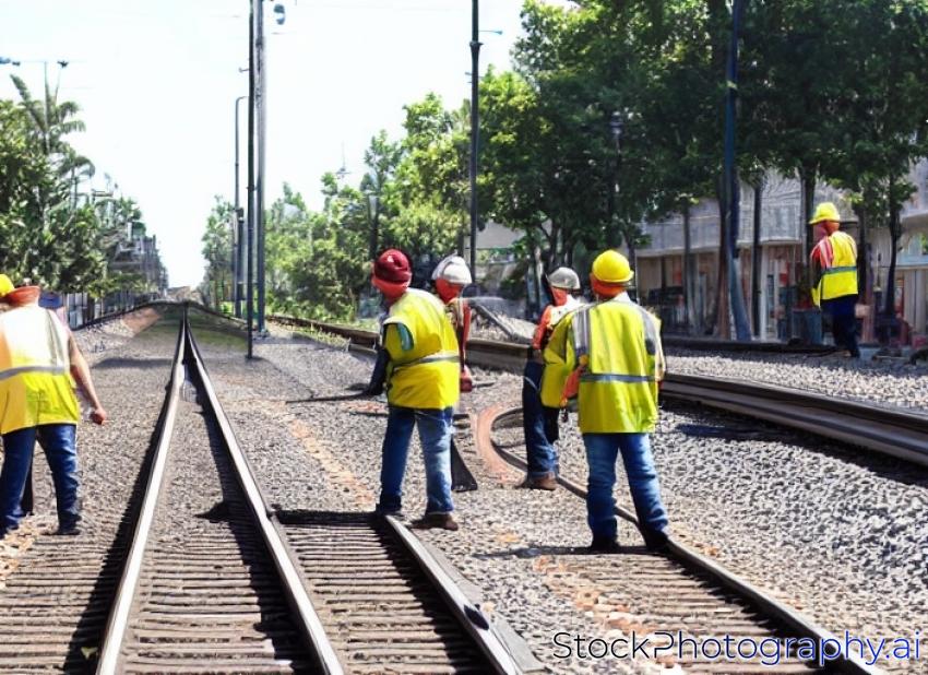 authority ballast checkup coaches construction cutting danger field fire hammer hot industrial industry iron jacket light maintenance make men metropolitan orange outside overalls people platform public rail railroad railway repair sledge sledgehammer station structure subway ties track traffic train transport transportation tunnel underground urban work worker-