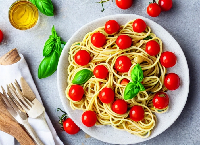 raw pasta with basil and cherry tomatoes