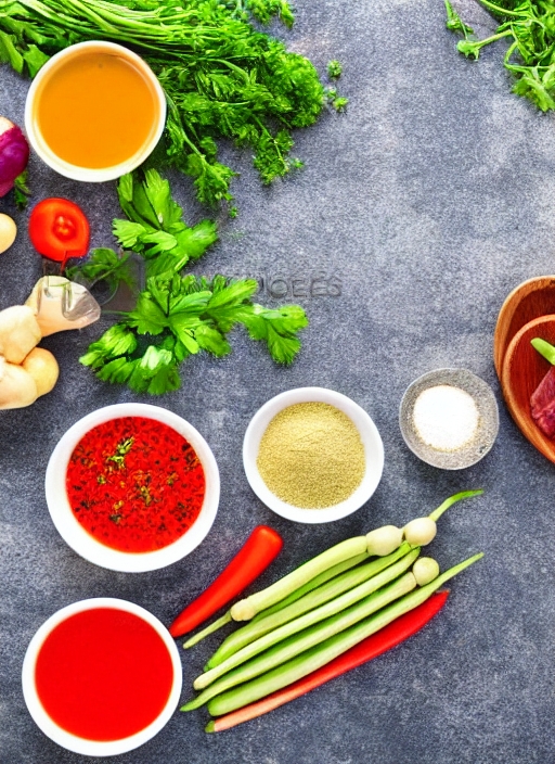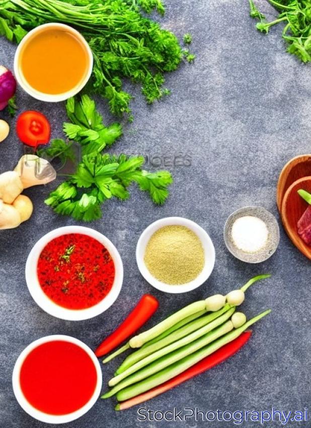raw vegetables and meat set with herbs and spices, ingredient for broth or soup, food background top view