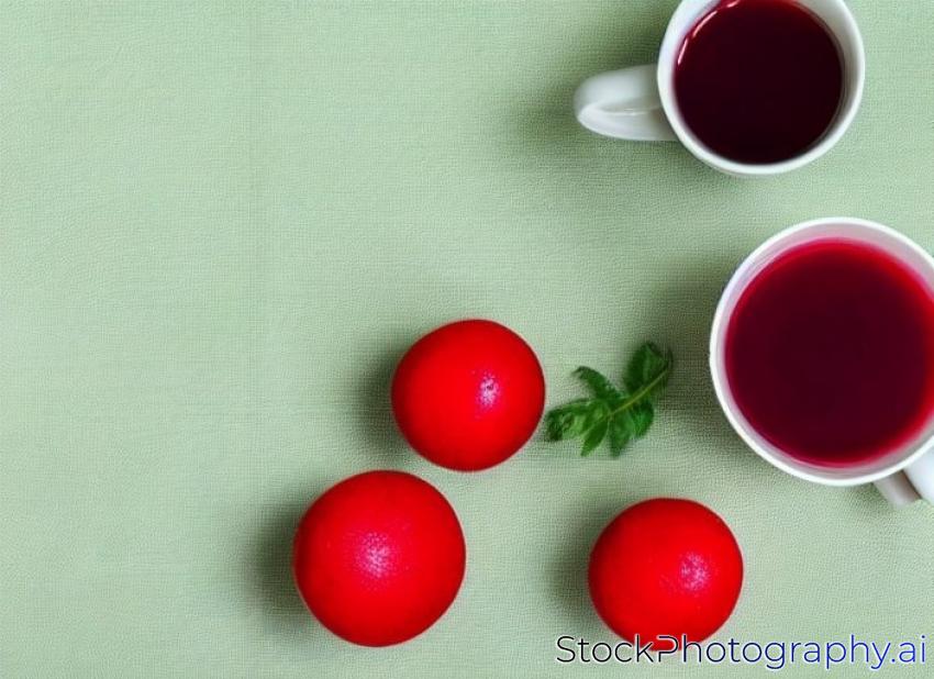 red juice in a ceramic mug on a table cloth with a green cell. top view