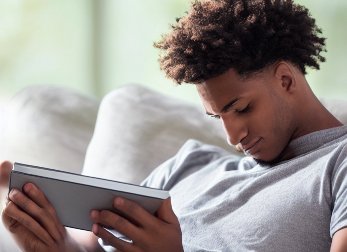 relaxed young man reading e-book