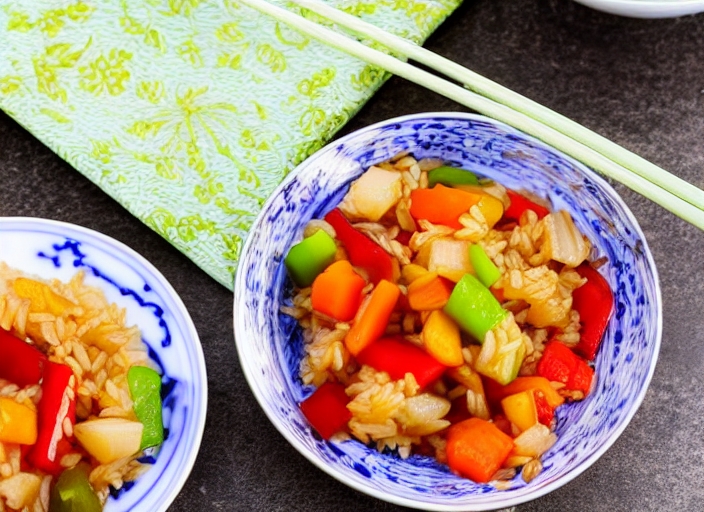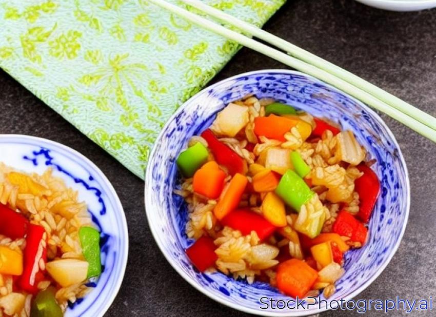 rice in a chinese dishware with sweet and sour veggies in the background.