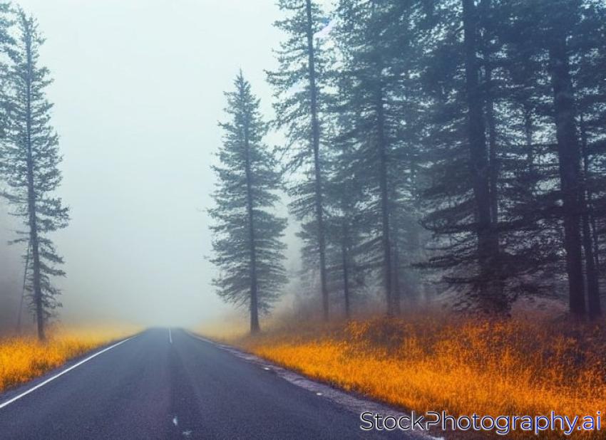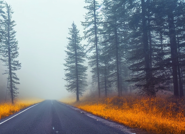 road through the foggy meadow near spruce forest in mountains at night in full moon light