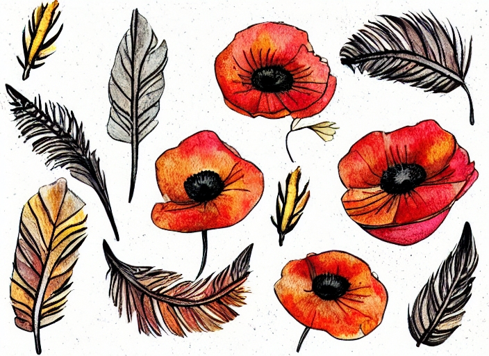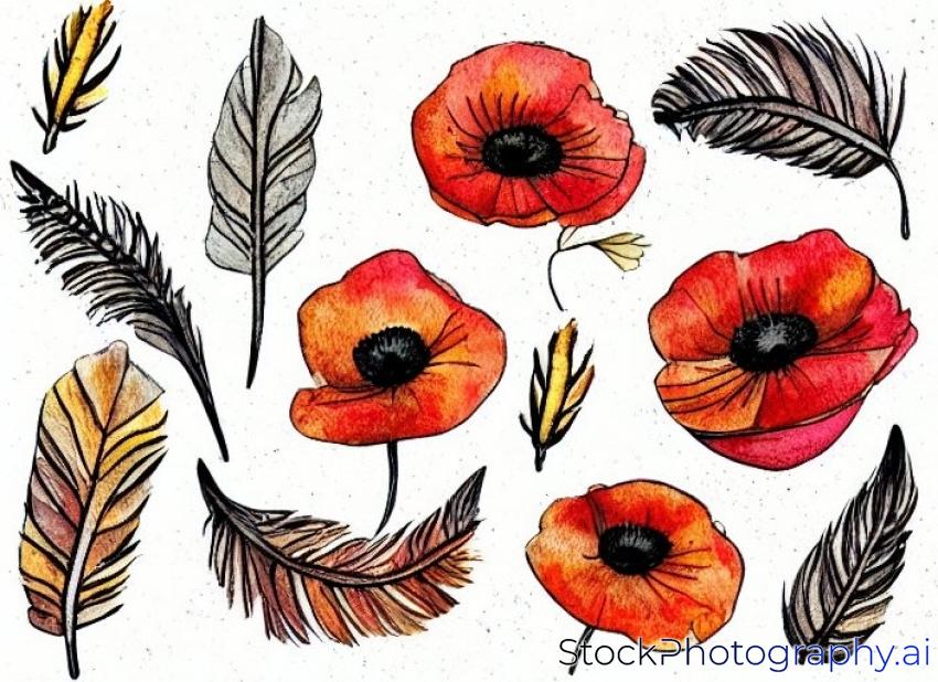 seeds poppy, feathers, autumn leaves, card with place for text, watercolor illustration, hand drawing