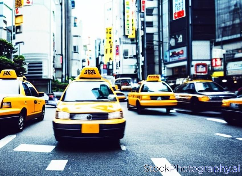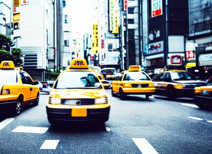 selective focus on mobile phone to take picture of a group of taxi car in the tokyo