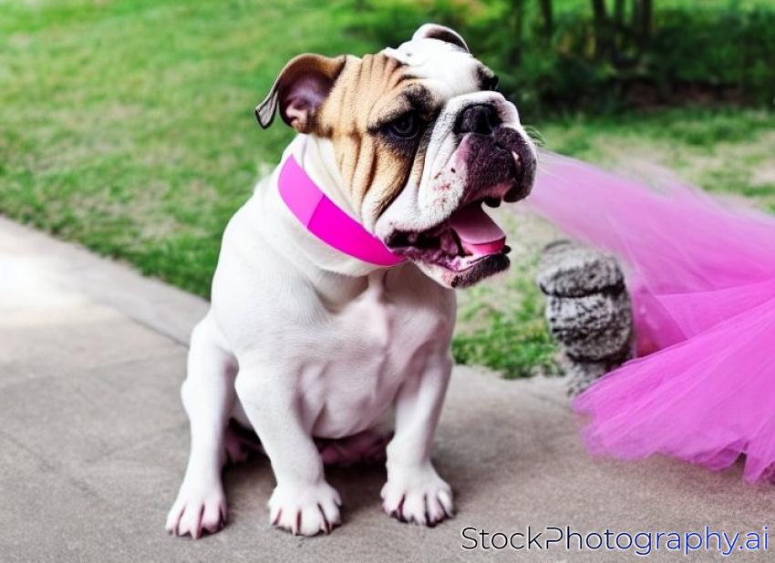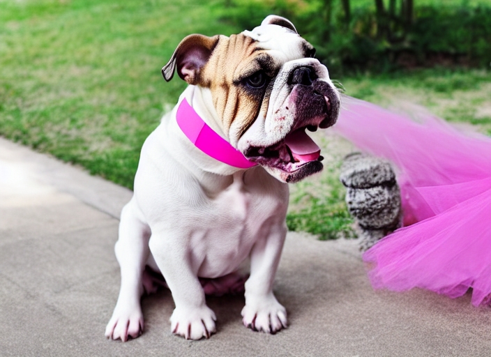 senior female bulldog wearing a tulle pink collar