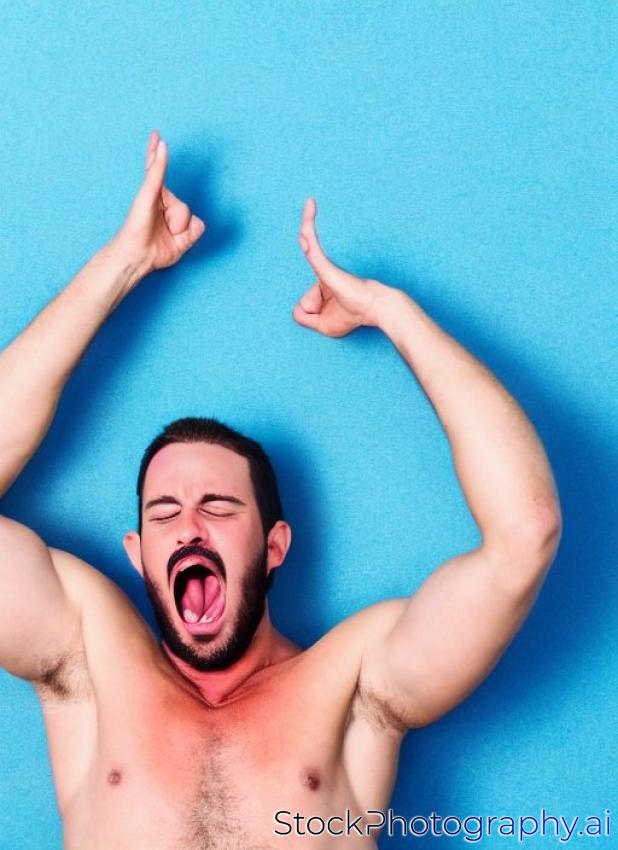 shirtless man screaming with head beatween his hands, on blue background