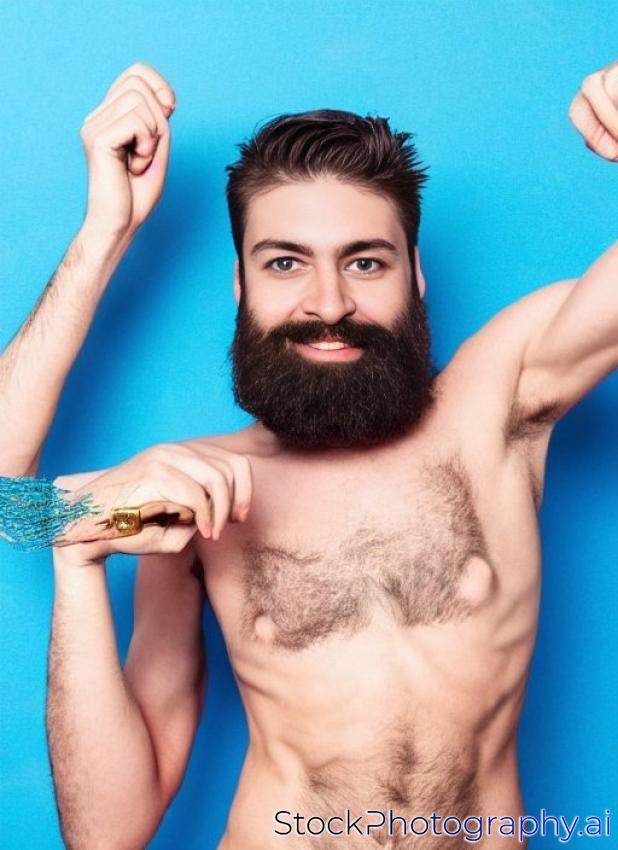 shirtless man with beard on blue background, making a fake pistol with his hands