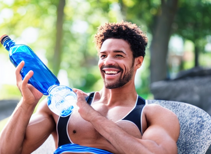 smiling male athlete with bottle of water relaxing after workout outdoors
