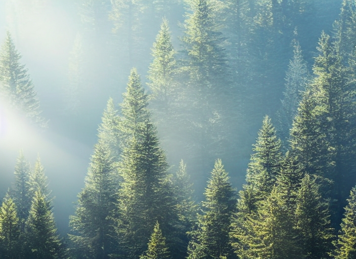 spruce trees in a foggy valley lightened by sun rays. view from the top