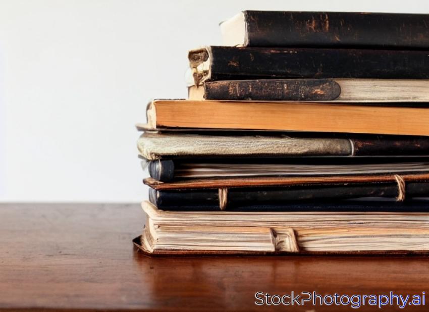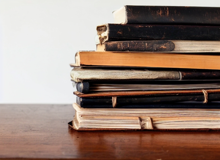 stack of vintage classic books wrapped with a leather belt on a dark distressed table