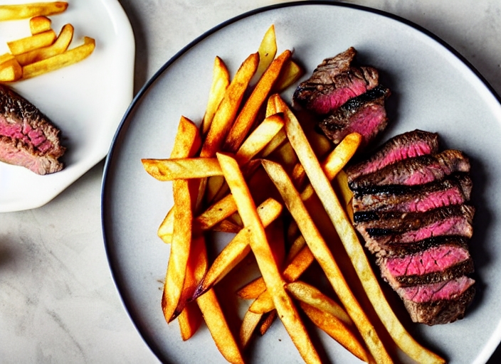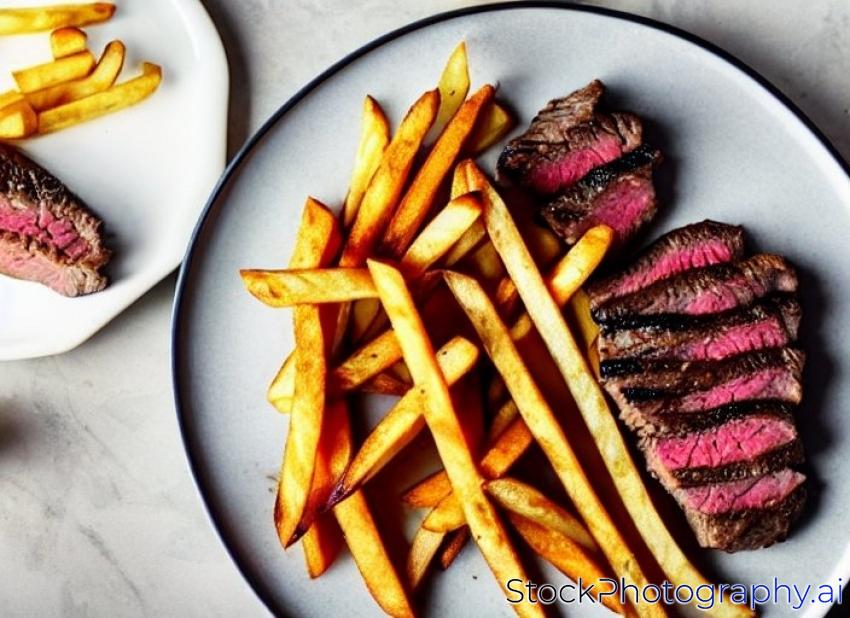 steak and fries on a plate with focus on the steak