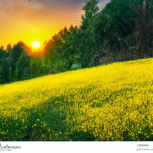 summer landscape. yellow flowers on the meadow hillside. village near forest in fog on the mountain at sunset