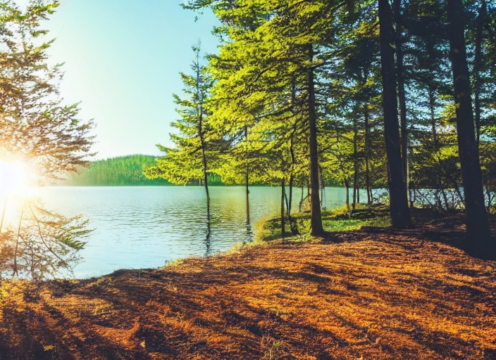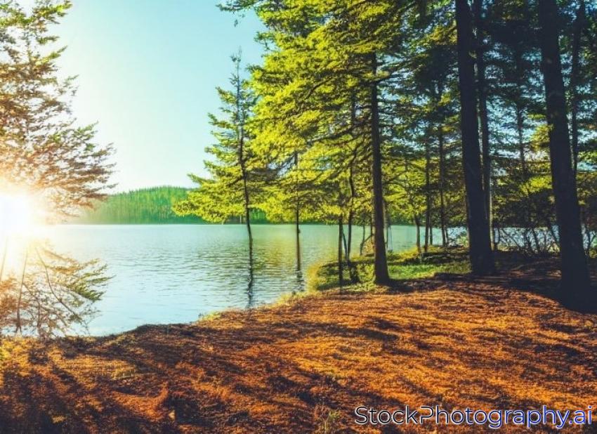 sunny forest on the shore of lake