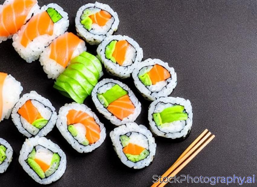 sushi and sushi rolls, sushi nigiri on stone plate on dark background, mustard wasabi, and ginger