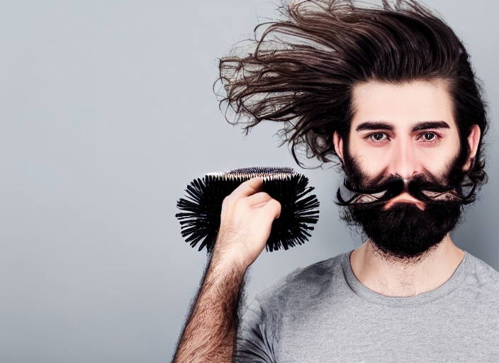 tangled beard. handsome young man with long dark haired beard and moustache on surprised scary face holding hair brush on grey background