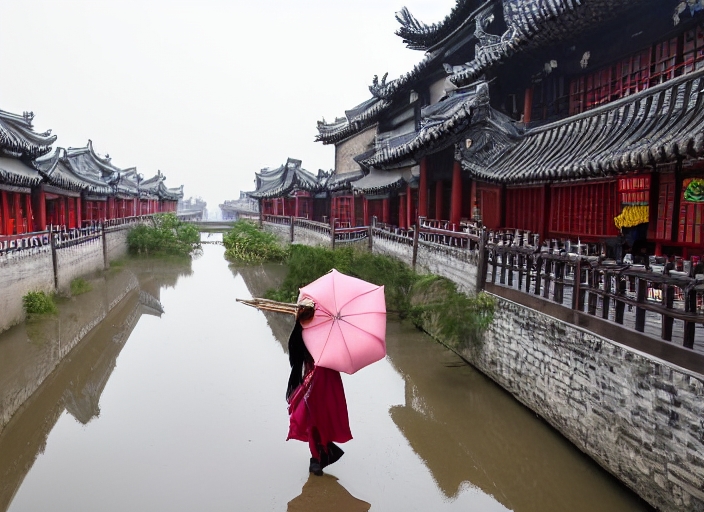 A chinese woman holding an umbrella walking over a bridge in Xinchang Ancient Town in Pudong new area of Shanghai China.