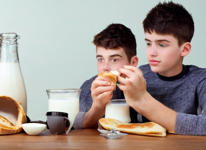 teenage handsome boy have breakfast with mug of milk and tortilla bread