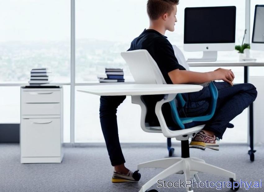 teenager with his feet up on a desk in office over white
