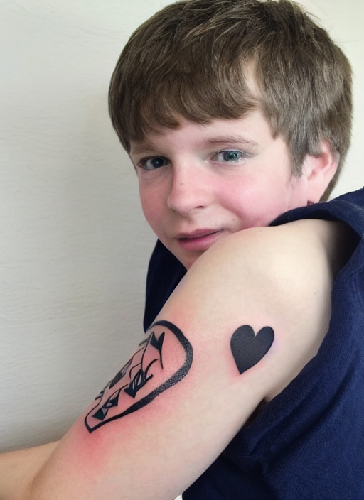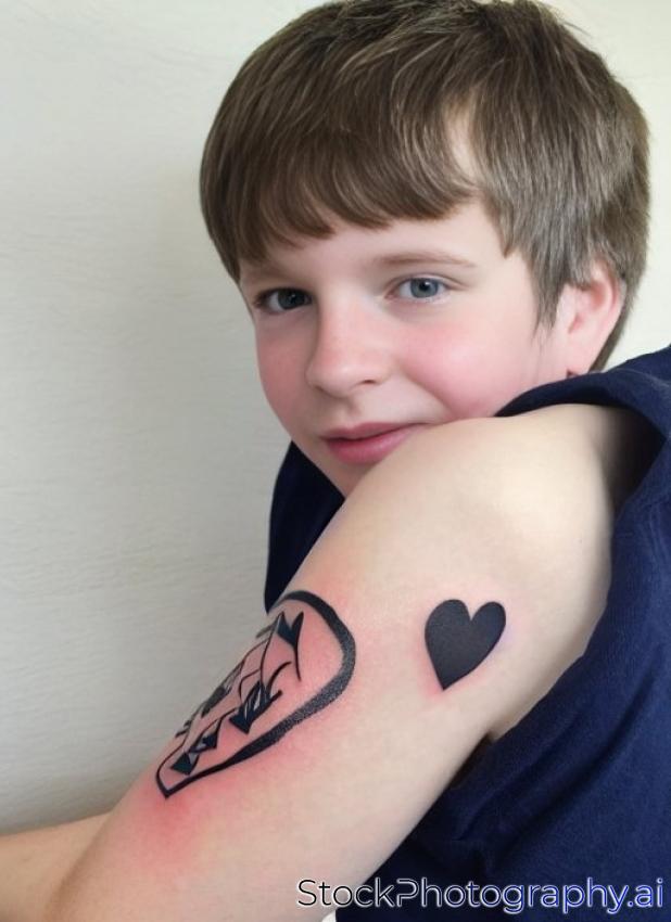 ten year old boy with a tattoo of a heart on the arm