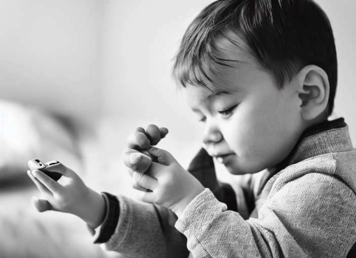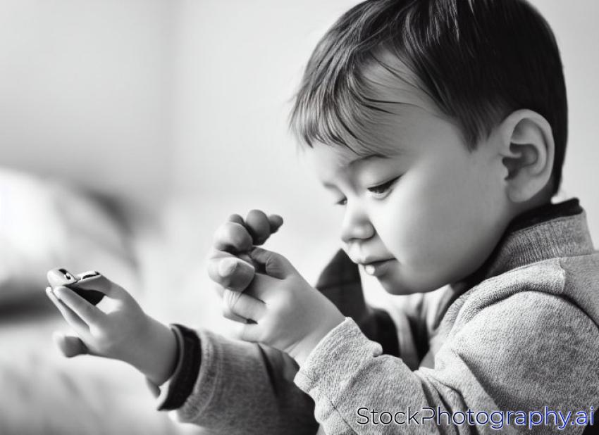 toddler boy playing and touching a mobile phone ( black and white )