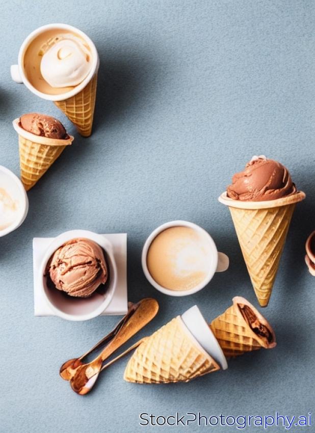 top view of ice cream box,cup of coffee and waffle cones on the table