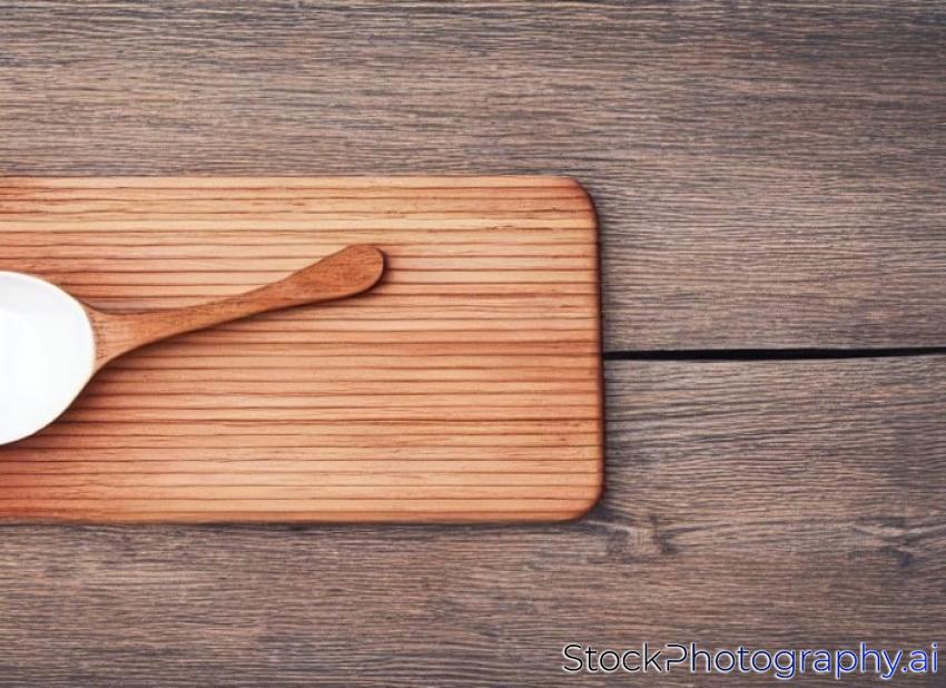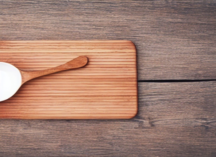 top view of wooden cutting board with spoon on old wooden table