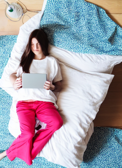 top view, single young woman using a laptop in bed by a sunny morning, the bedding has bright colors