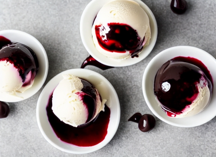 two balls of vanilla ice cream garnished with winter cherry and chocolate sauce
