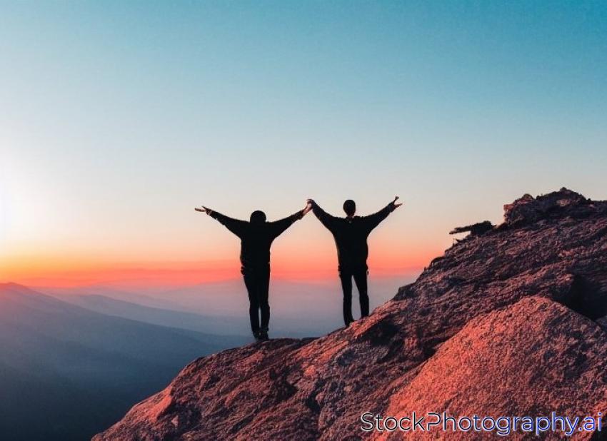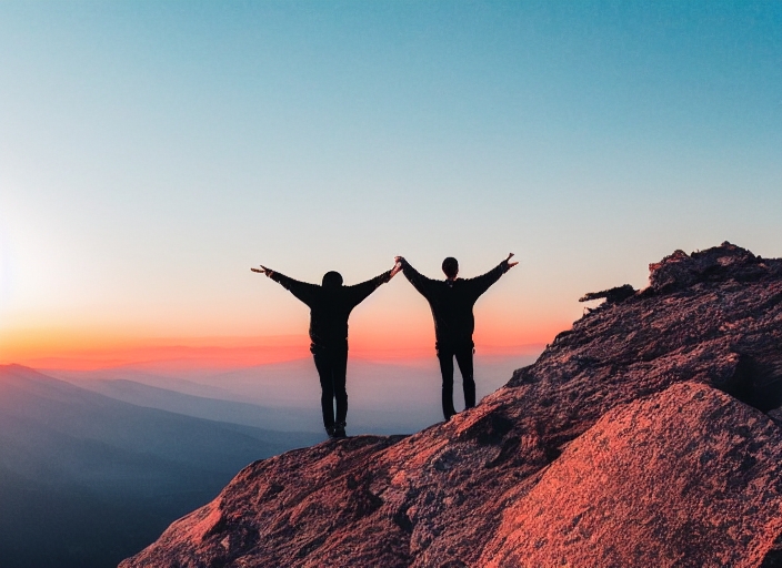 two man in mountain at the color sunset