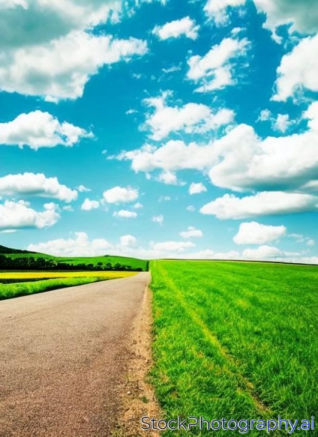 vintage road through fields with green grass and blue sky with clouds, natural background