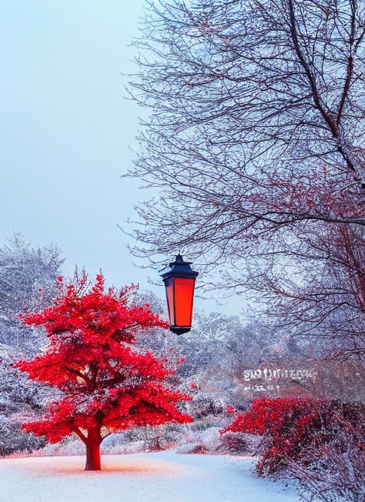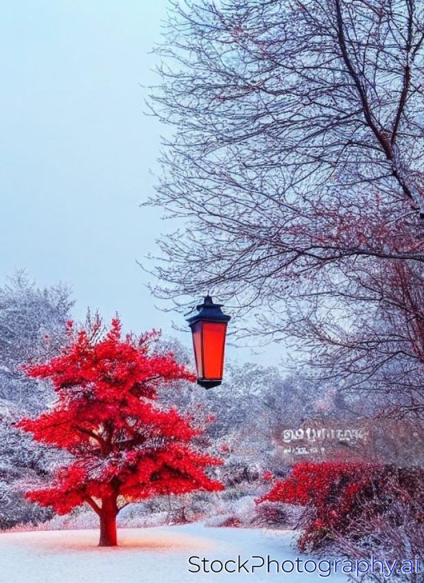winter landscape with lantern and rowan tree with red berries. beautiful winter scene with frozen snowy trees, natural background. new year and christmas festive season. cold weather