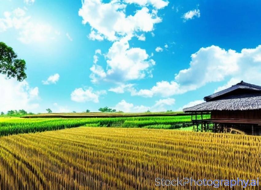 wooden terrace and beautiful rice field landscape with blue sky and cloud.
