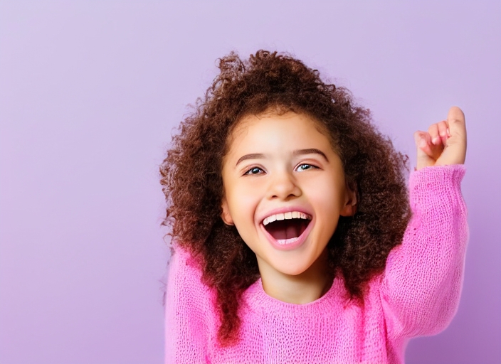 young girl with yellow sweater looking up while smiling on isolated pink background